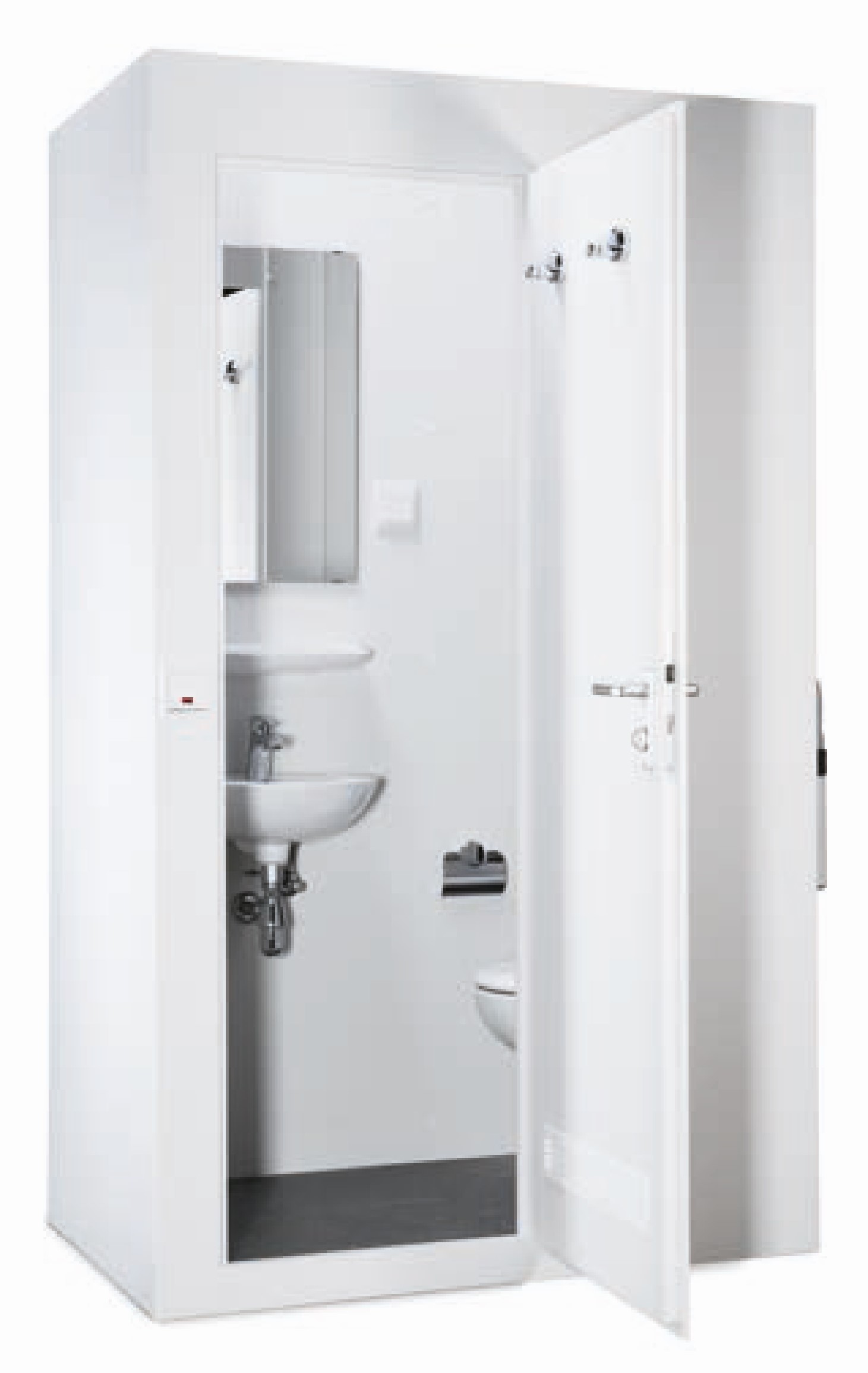 Die WC-Kabine ist ausgestattet mit einem wandhängenden Keramik WC und Handwaschbecken.Der platzsparende rechteckige Grundriss kann passend für die rechte oder linke Raumecke gestaltet werden. Alternativ kann das Handwaschbechen durch eine Waschtisch ersetzt werden.
