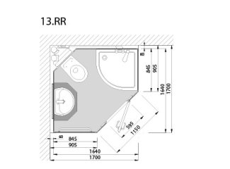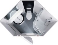 Das Fertigbad "Flex Eck" ist ein komplett und hochwertig eingerichtetes Fertigbad mit Viertelkreisdusche, wandhängendem Keramik-WC und Porzellanwaschtisch; passend für die rechte oder linke Raumecke.
