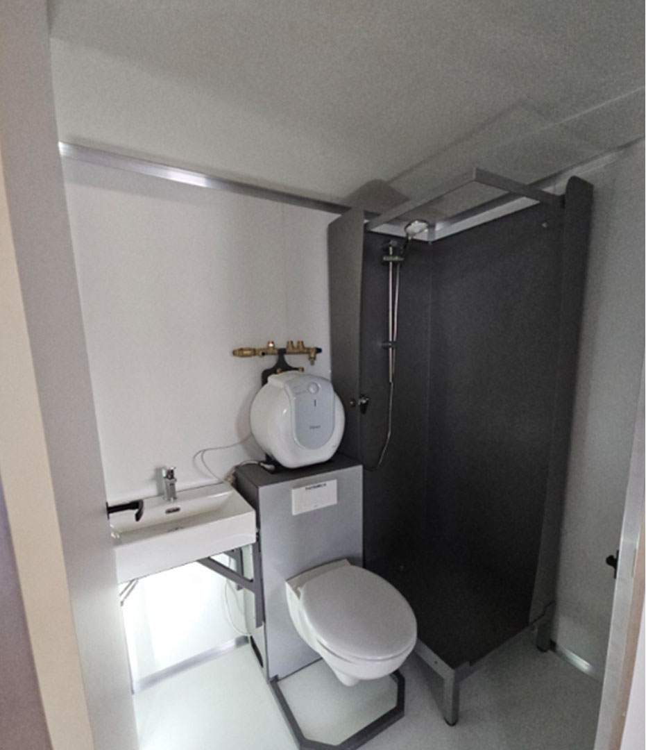 Als Aufstellort eignet sich der Innenbereich oder auch der Balkon. Ideal als Ersatzbad während der Sanierungen oder überall dort, wo kurzfristig Sanitärkomfort gebraucht wird – z. B. im gewerblichen Bereich, für Agrarbetriebe und saisonale Arbeitseinsätze. Auf Wunsch auch mit Unterkonstruktion und Aufnahme für Stapler möglich.